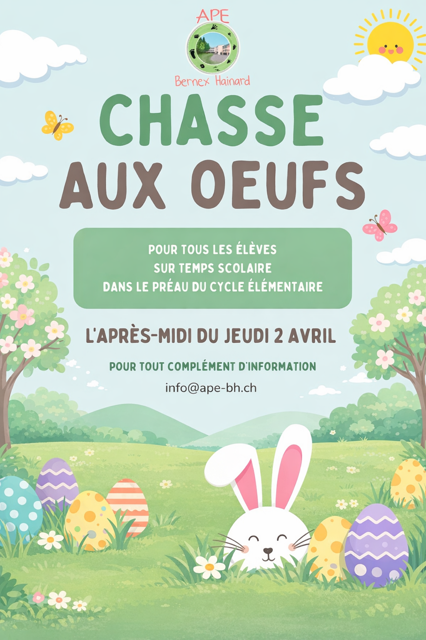 Pour Pâques, l'association organise une chasse aux œufs festive et gourmande pour tous les enfants de l’école, encadrée par les enseignants pendant les heures de classe — comme chaque année, les chocolats sont offerts par l’association pour le plus grand bonheur des petits !